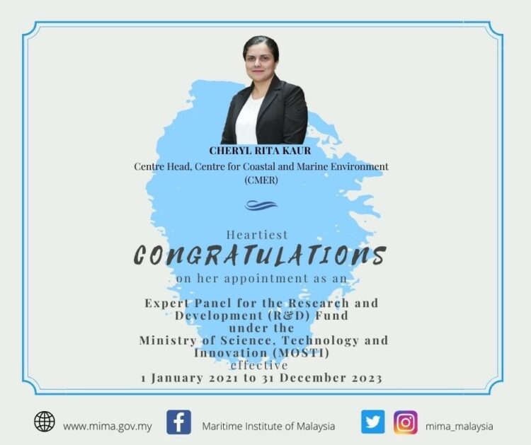 MIMA is delighted to be recognised in the Expert Panel for the Research and Development (R&D) Fund under the Ministry of Science, Technology, and Innovation (MOSTI) Malaysia for projects funded by the Government. Cheryl Rita Kaur, Head of the Centre for Coastal and Marine Environment MIMA has been appointed to serve on the Expert Panel for the duration from January 2021 to December 2023, in recognition of her expertise and experience in her field of work by the Ministry.